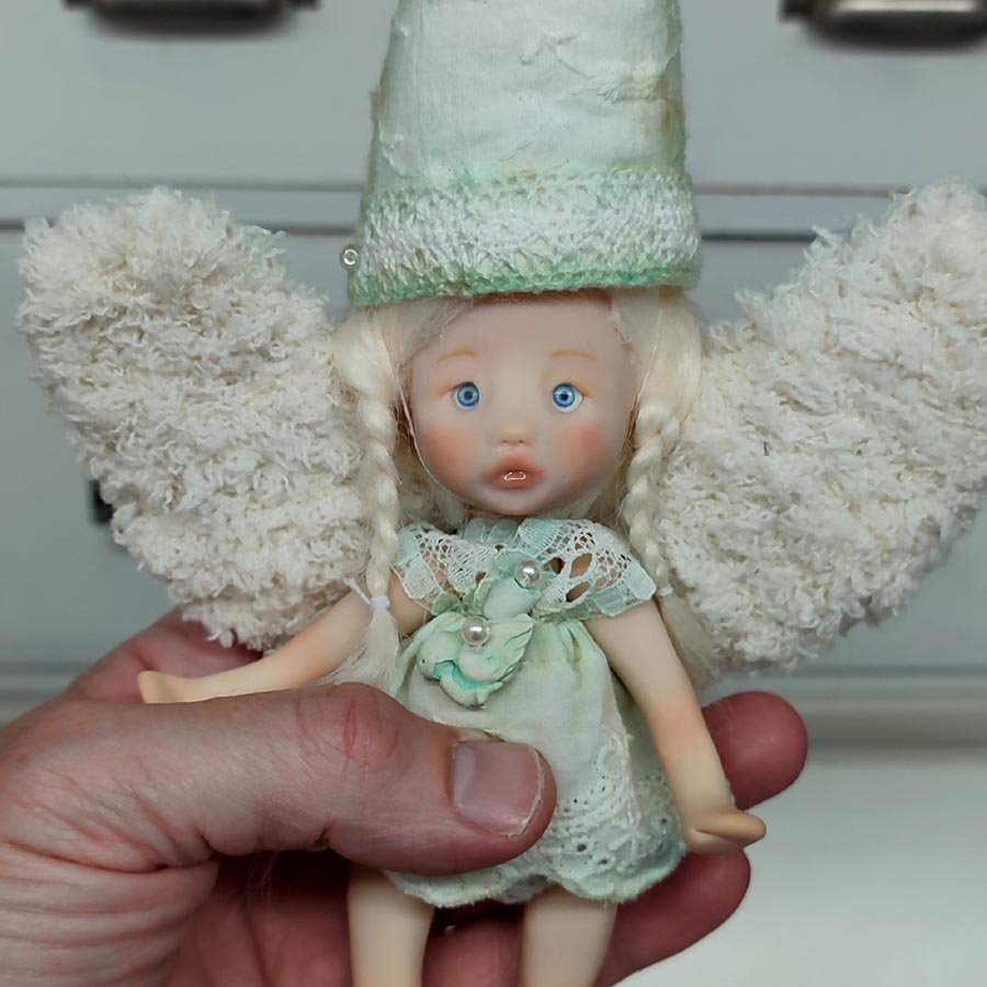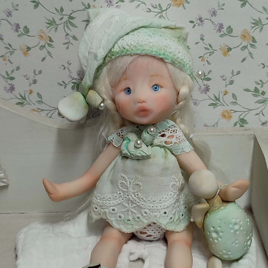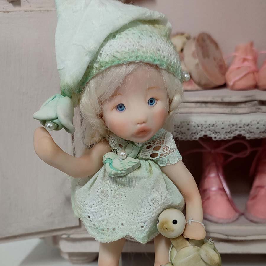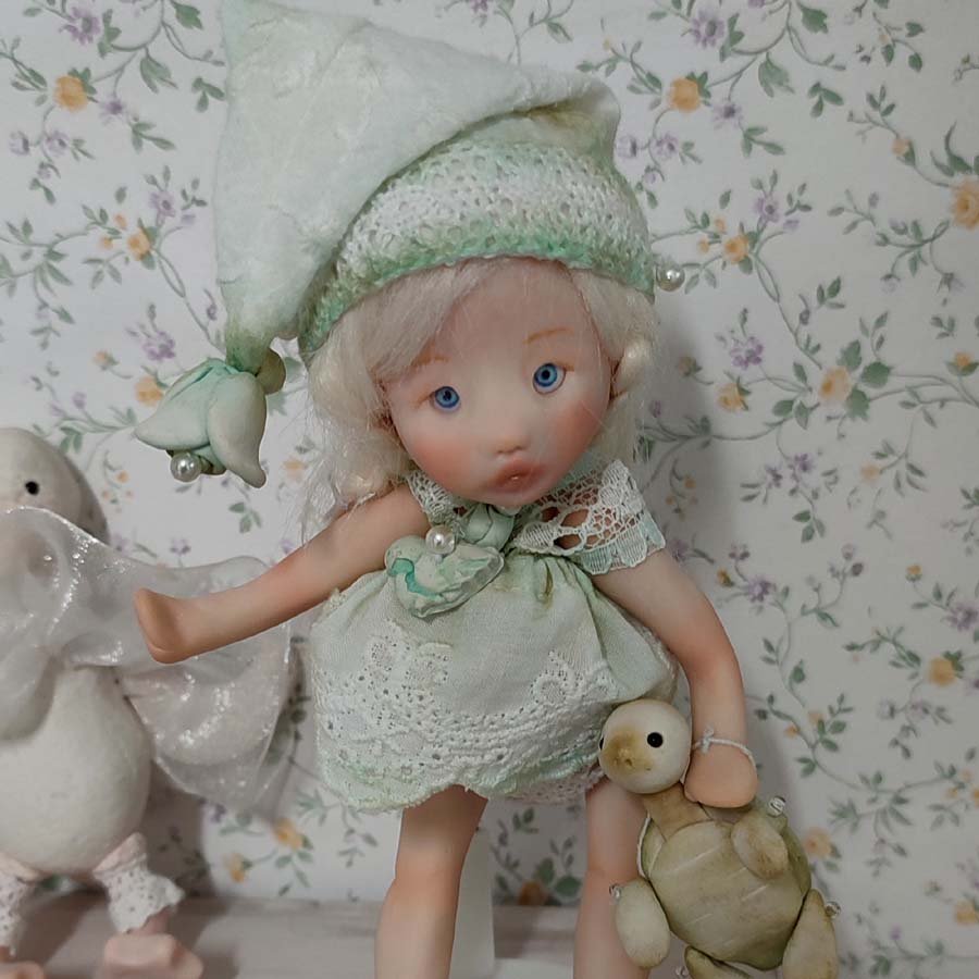 Mide unos 17 cm. sin contar el gorro. Está modelada por partes que van unidas mediante hilos elásticos para que pueda mover brazos y piernas. Incluye un vestido, un gorrito a conjunto, unas alas y una tortuga de arcilla.