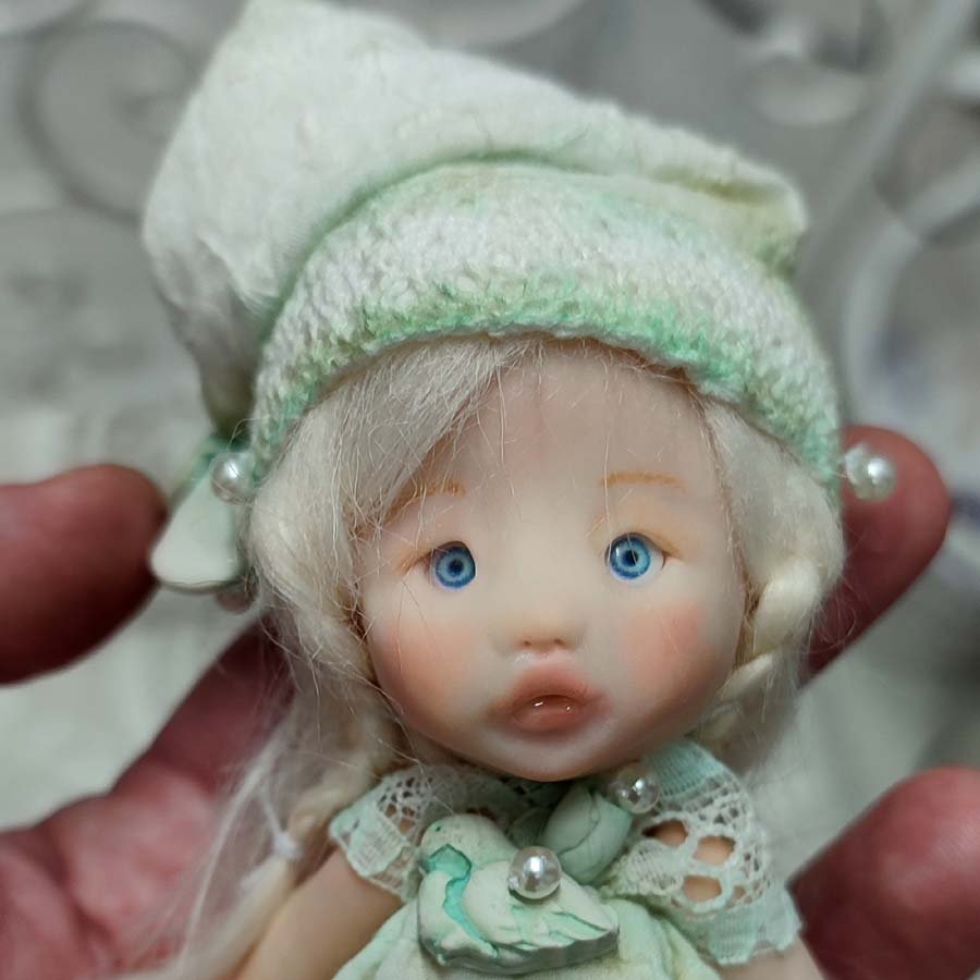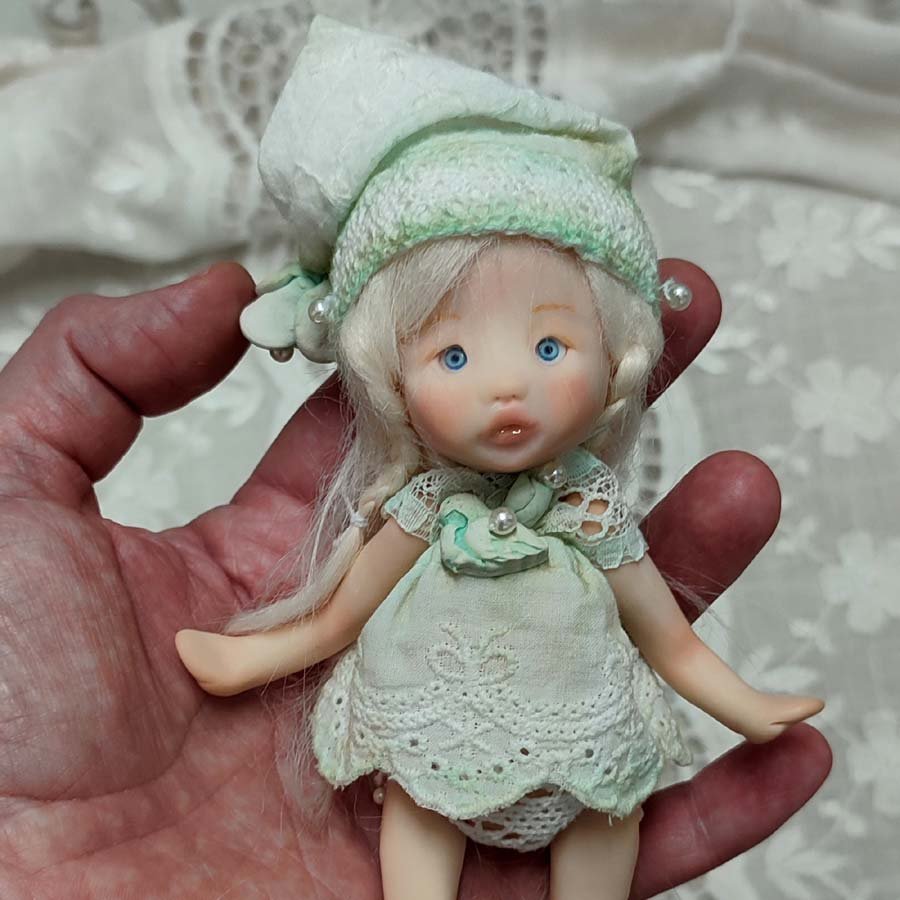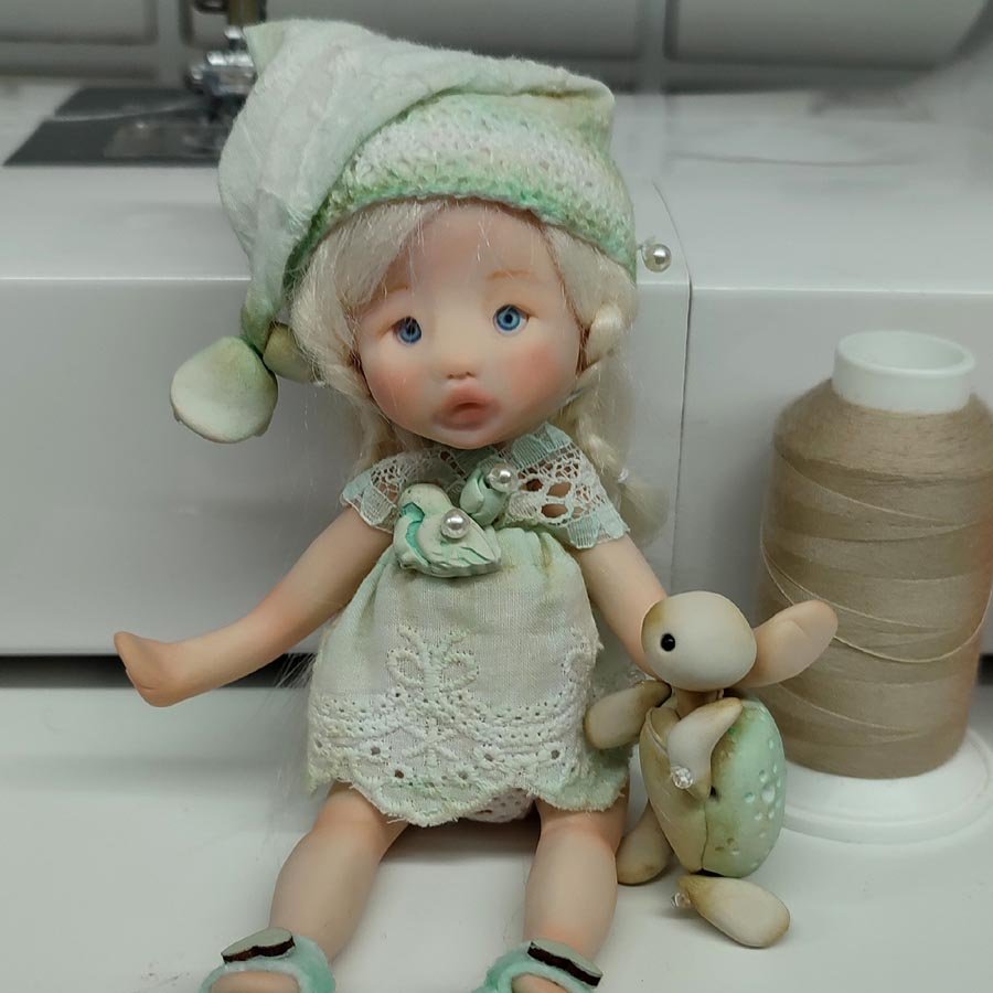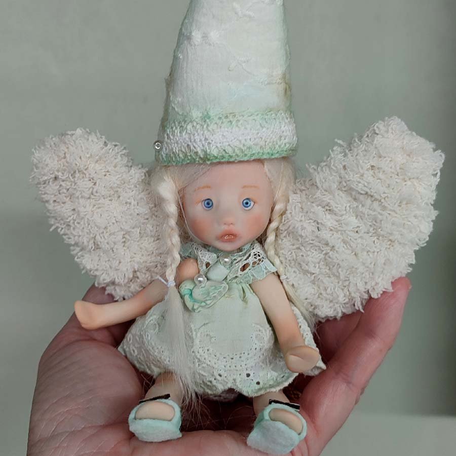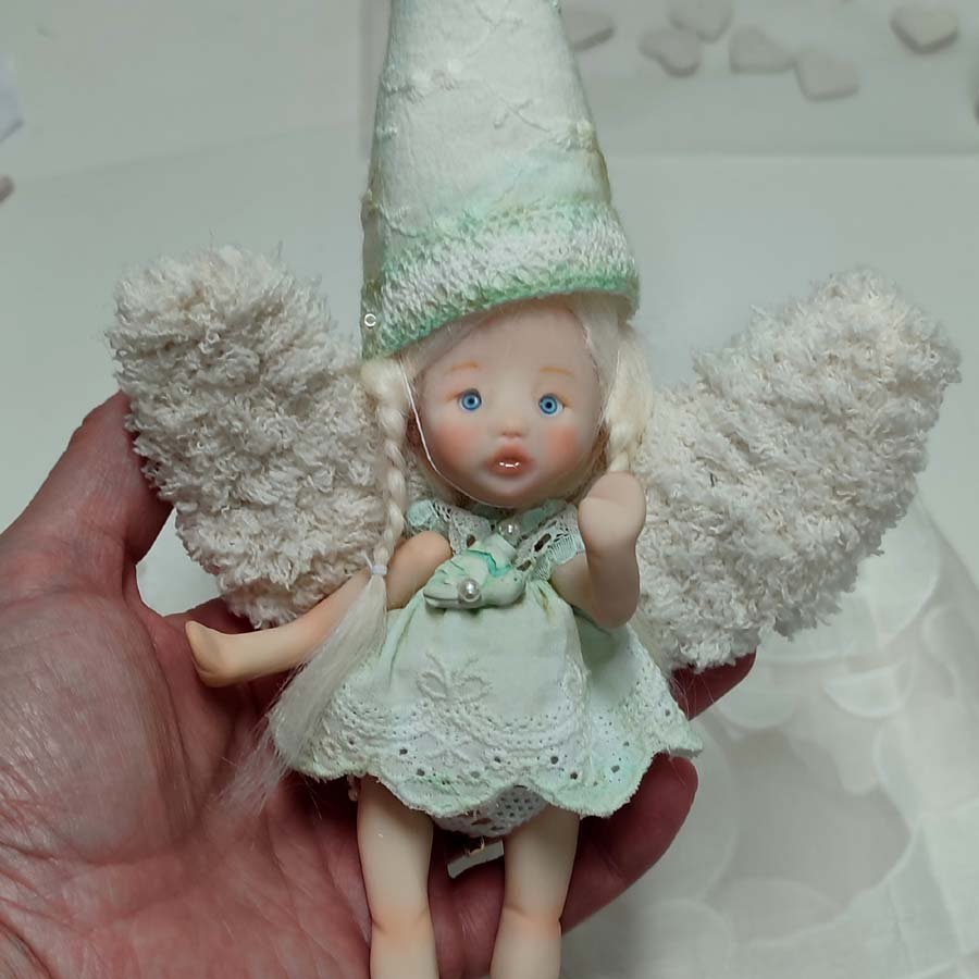 Mide unos 17 cm. sin contar el gorro. Está modelada por partes que van unidas mediante hilos elásticos para que pueda mover brazos y piernas. Incluye un vestido, un gorrito a conjunto, unas alas y una tortuga de arcilla.