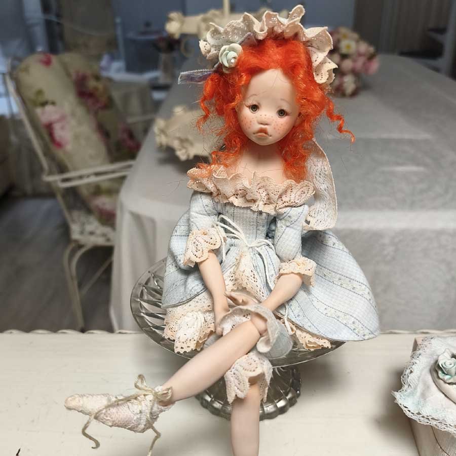 Está modelada en arcilla polimérica, su vestuario está hecho a medida con puntillas, telas delicadas y flores de arcilla.