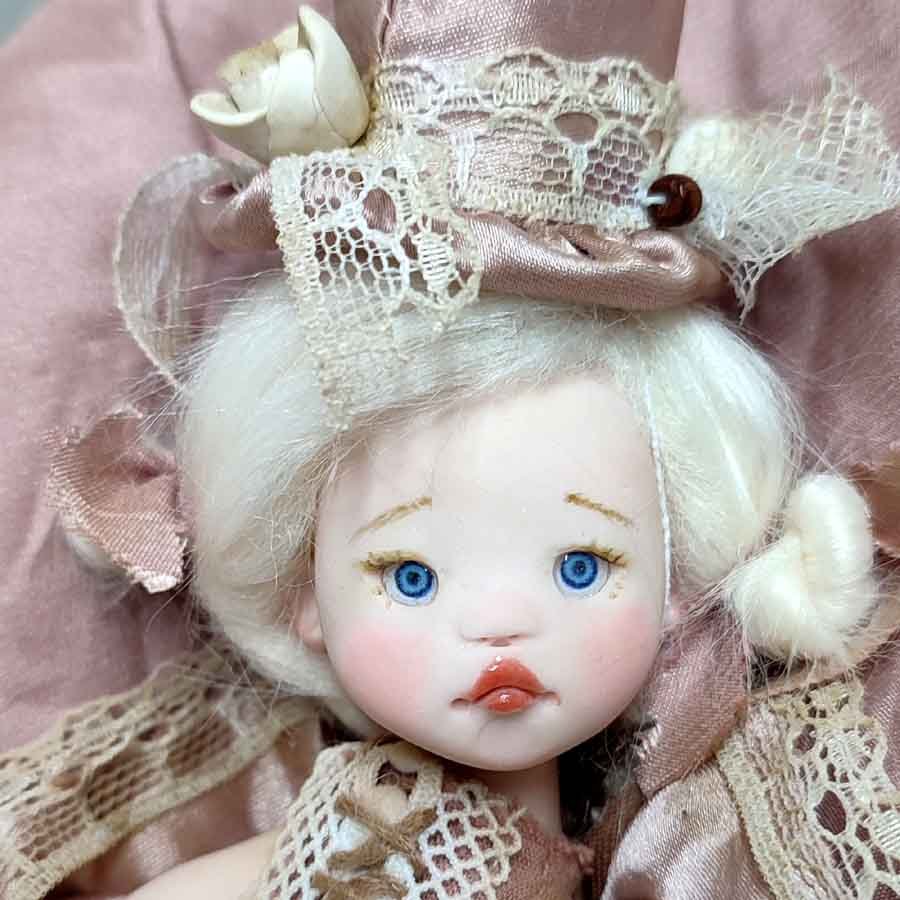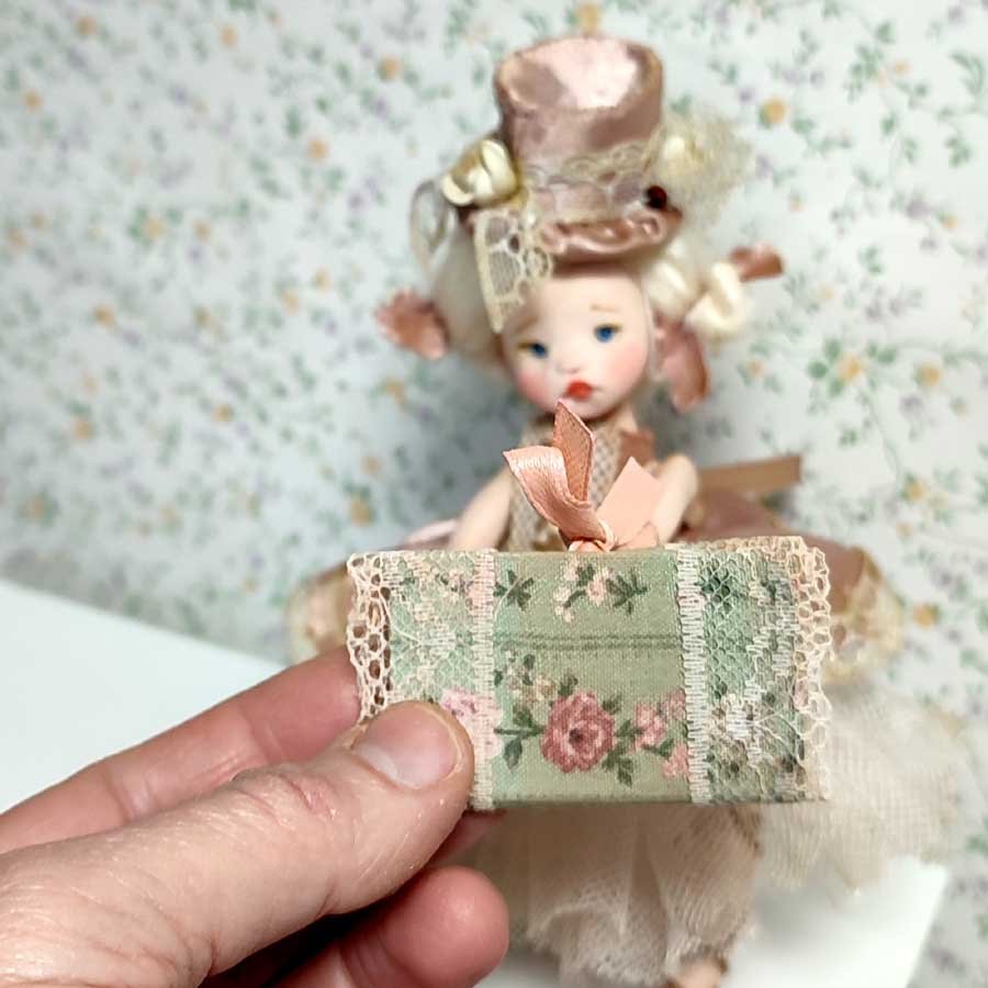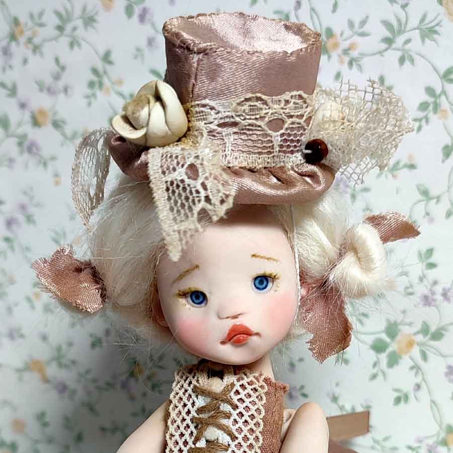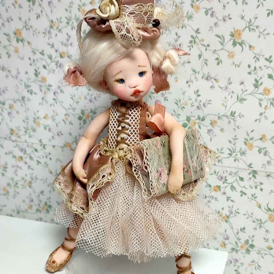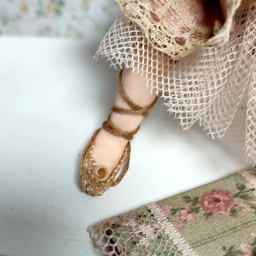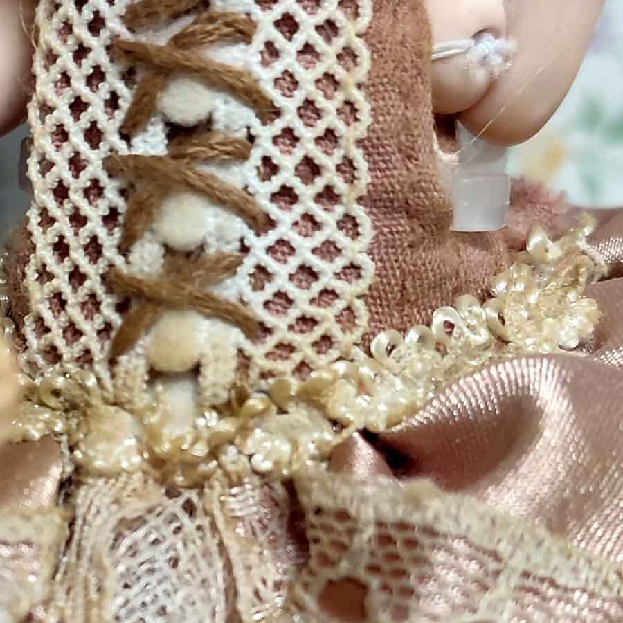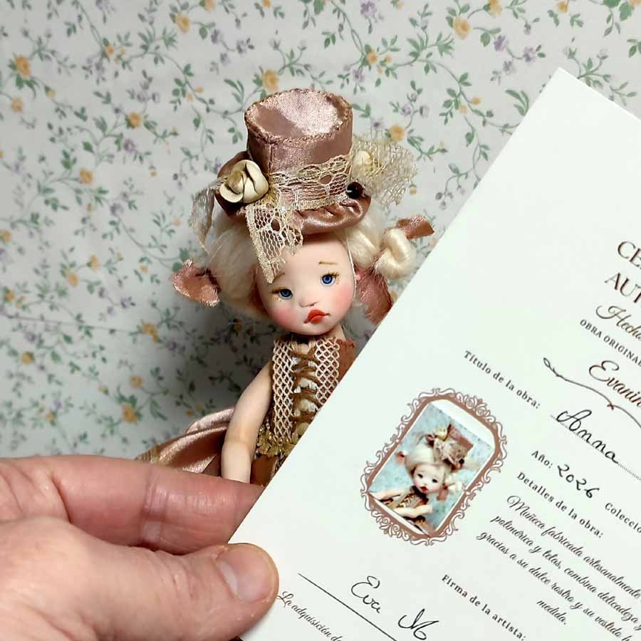 Está modelada en arcilla polimérica, su vestuario está hecho a medida con puntillas, telas delicadas y flores de arcilla.