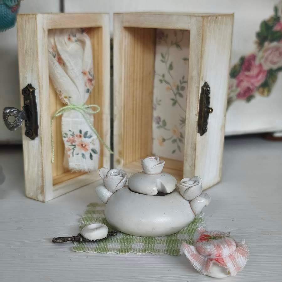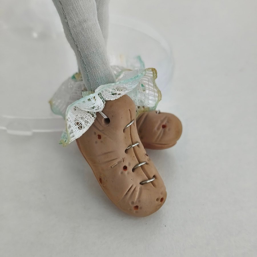 Está modelada en arcilla polimérica, mide unos 30 cm. y su vestuario está hecho a medida con puntillas y telas florales. Solo se sostiene de pie con un soporte.