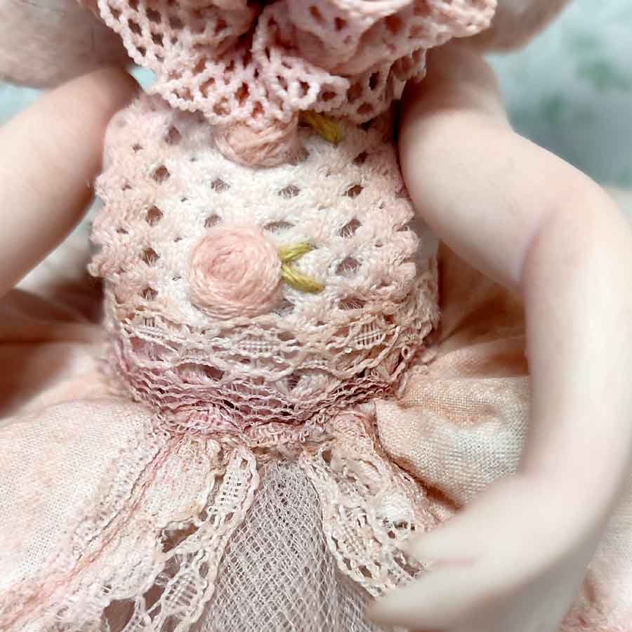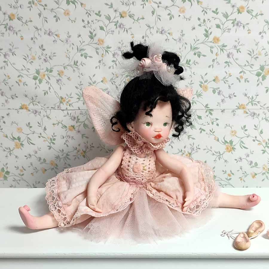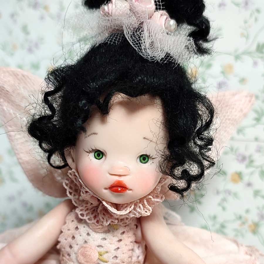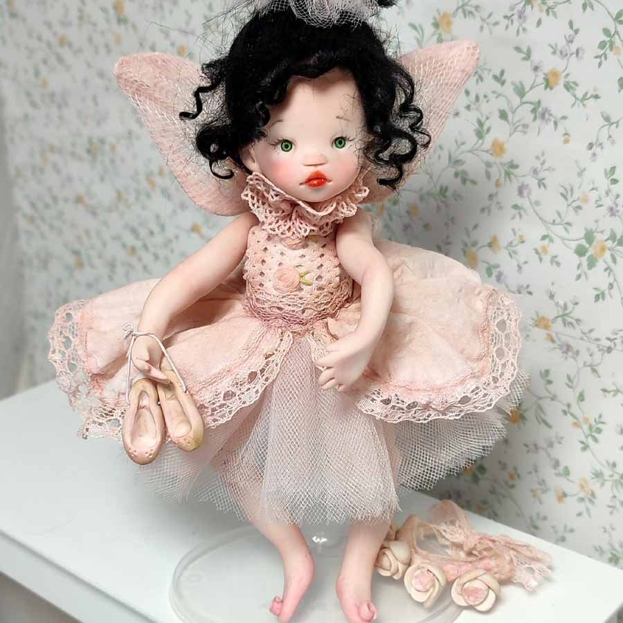 Está modelada en arcilla polimérica, su vestuario está hecho a medida con puntillas, telas delicadas y flores de arcilla.
