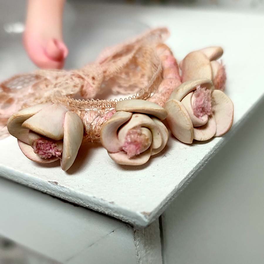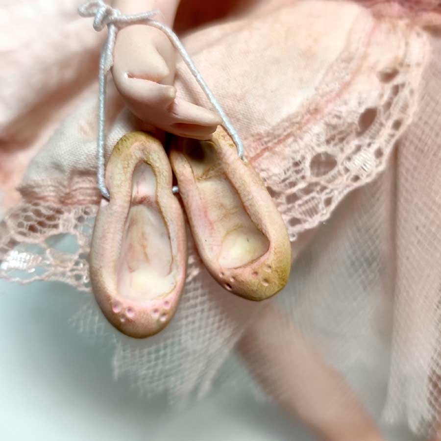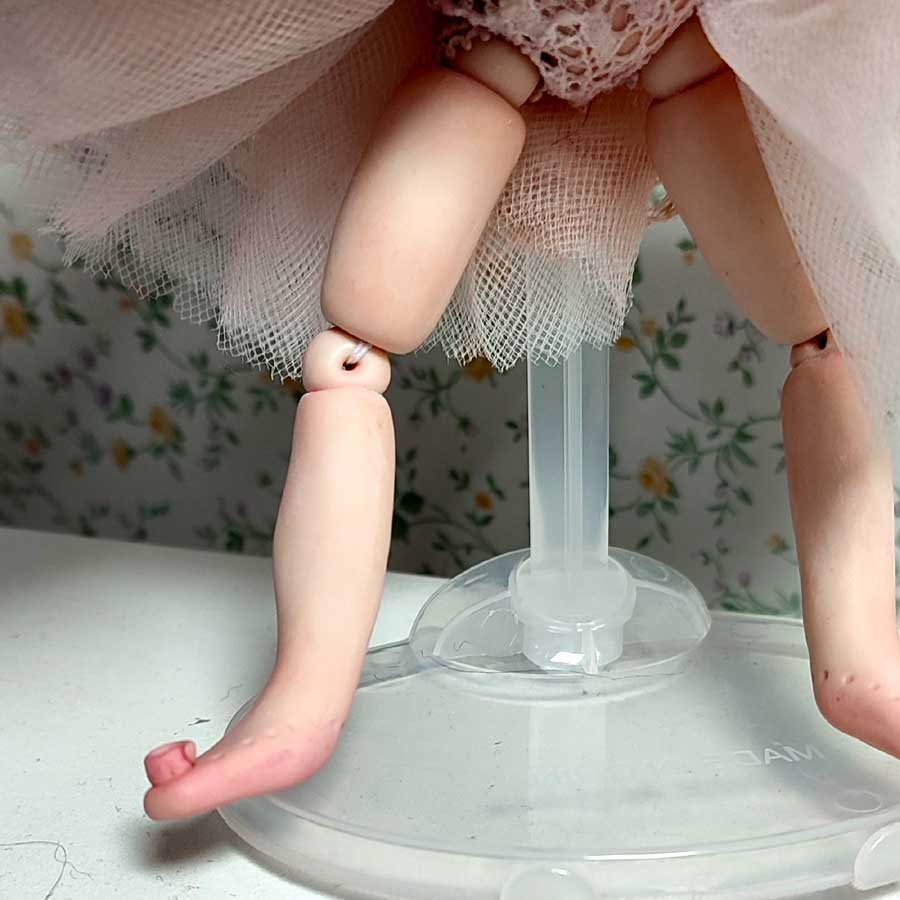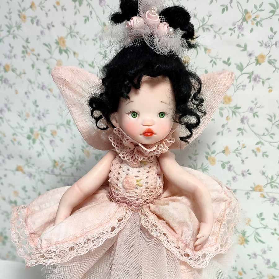 Está modelada en arcilla polimérica, su vestuario está hecho a medida con puntillas, telas delicadas y flores de arcilla.
