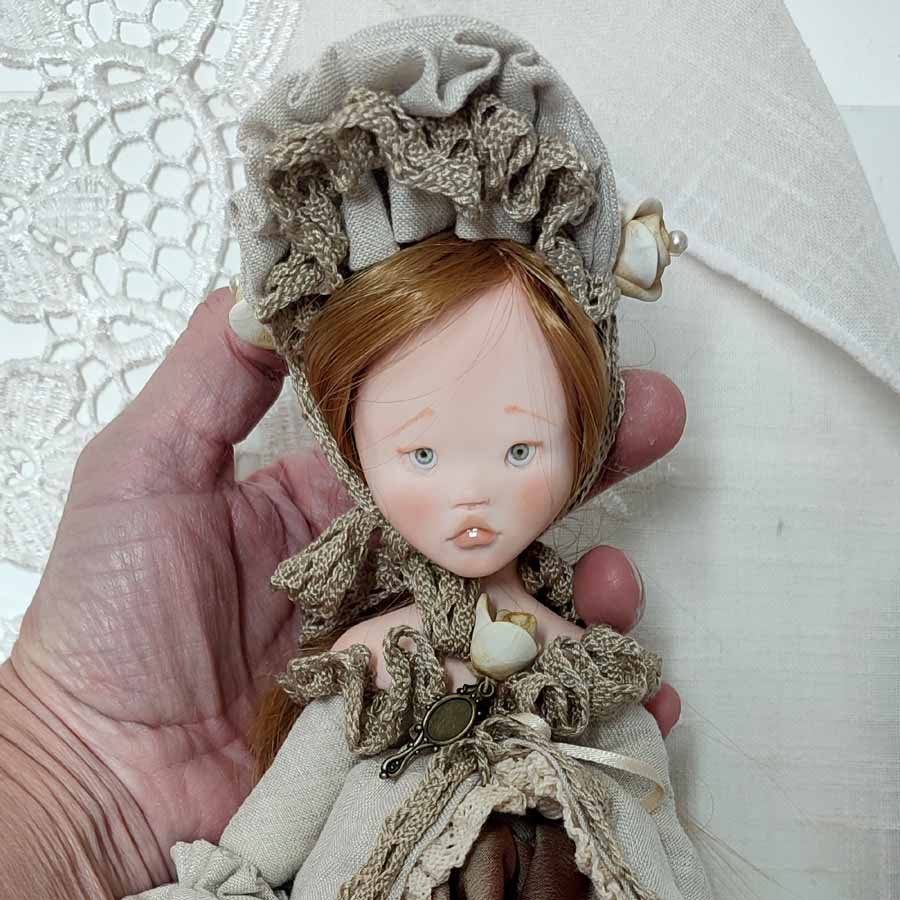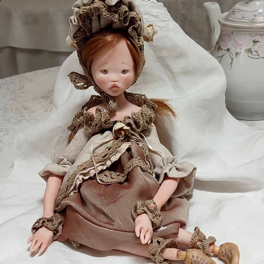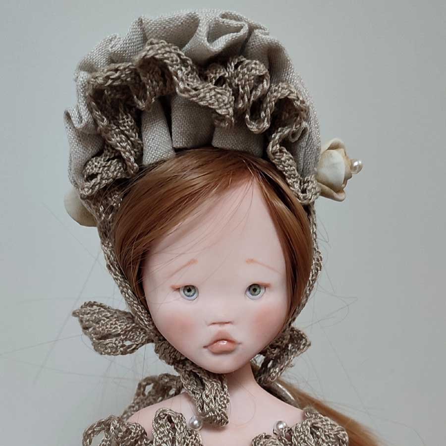 Mide unos 35 cm. sin gorro. Su falda es de lino y encaje y va anudada a la cintura. Sus zapatos están modelados, no se pueden quitar. No se mantiene de pie, necesita un soporte o un apoyo para mantenerse sentada.