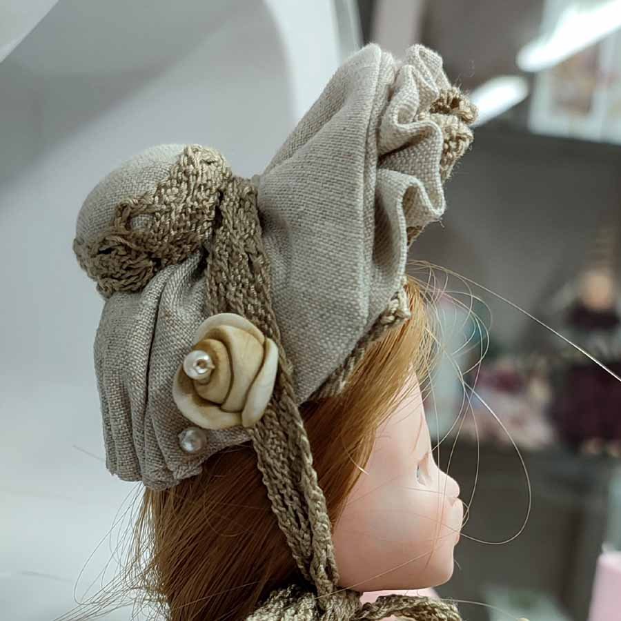 Esta muñeca rococó, lleva unas rosas en el sombrero que le aporta elegancia.