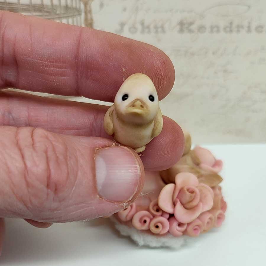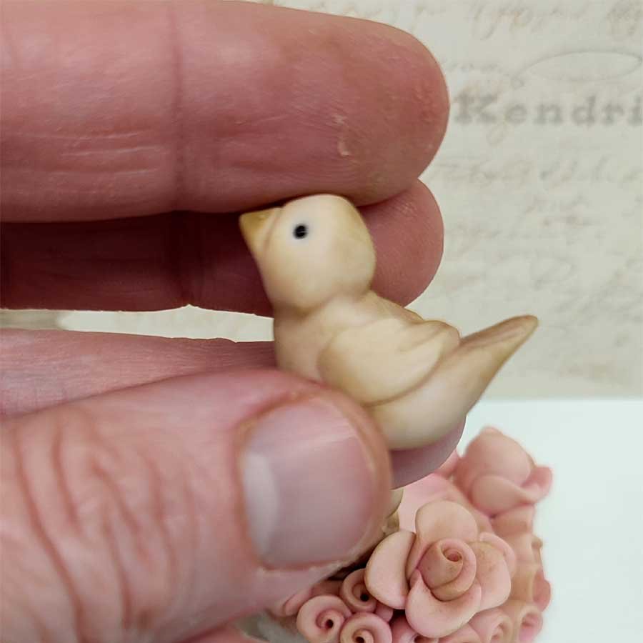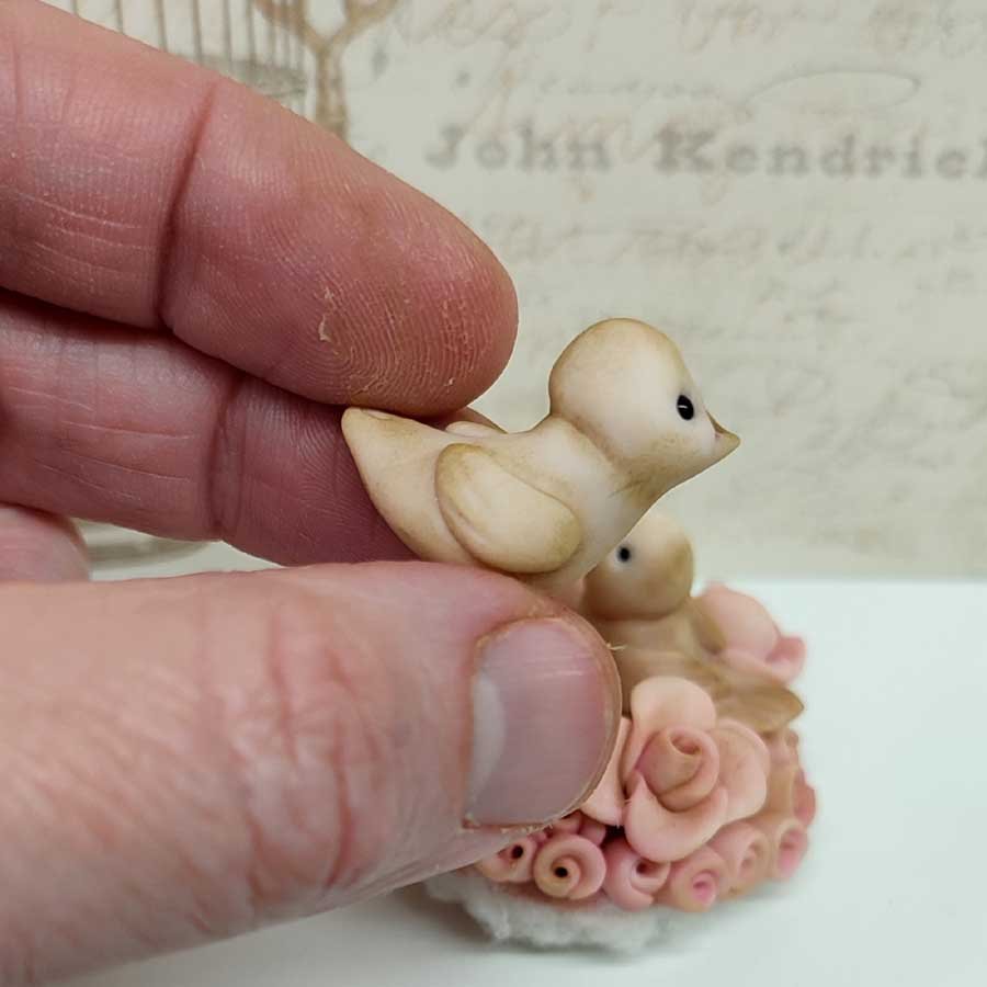 Estos pajaritos, miden aproximadamente 2,5 cm de alto x 2,5 cm de fondo, sin incluir la base, que mide aproximadamente 5 cm de diámetro. Todo el conjunto está coloreado con tizas pastel. Los pajaritos están sueltos en la base para que puedas quitarlos si lo deseas. Ten cuidado al moverlos. No fuerces las partes más finas, como sus colas o pétalos de las flores, ya que podrían romperse.
